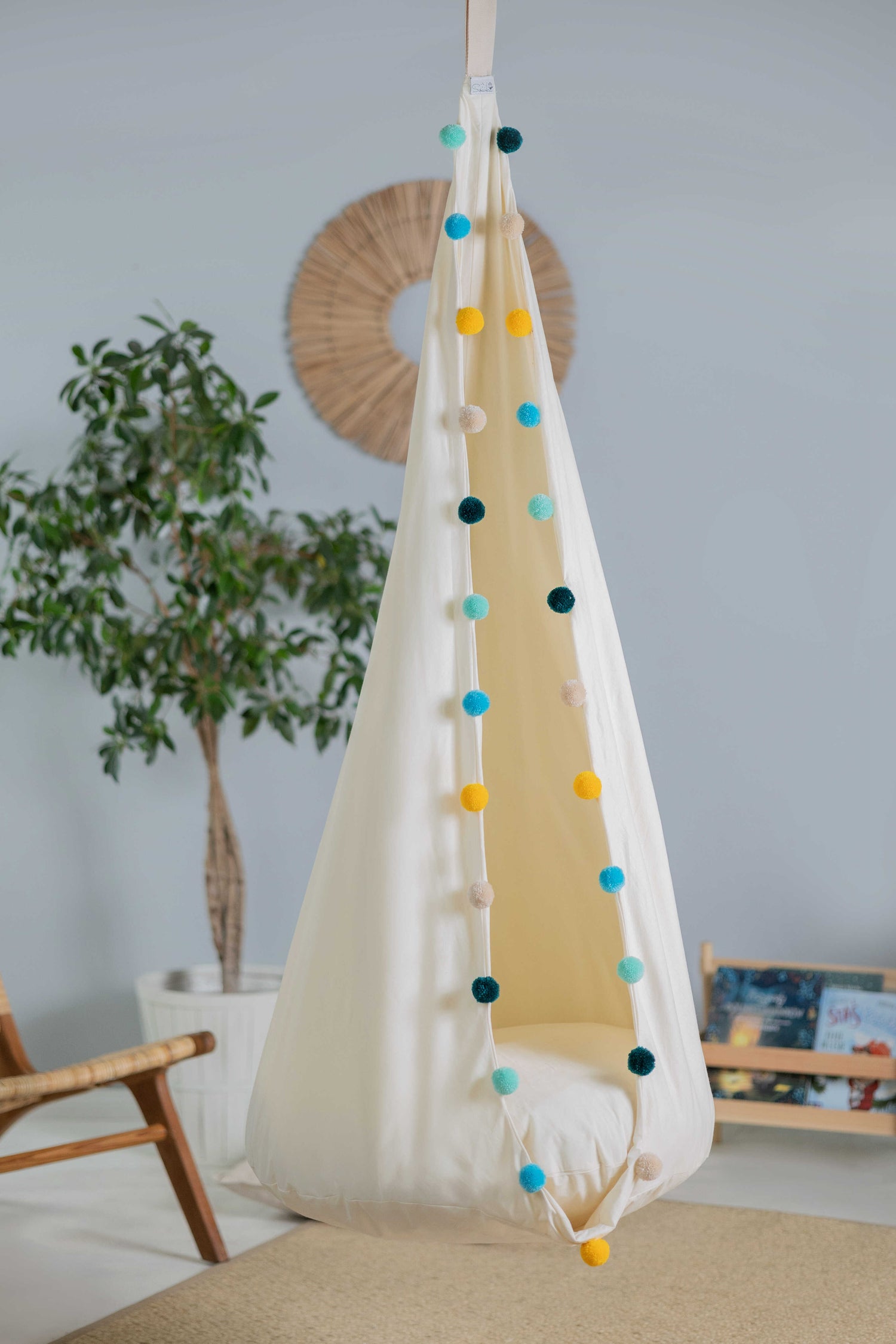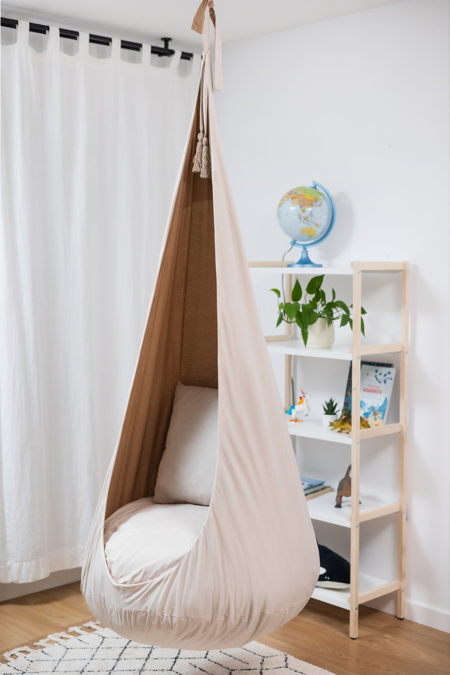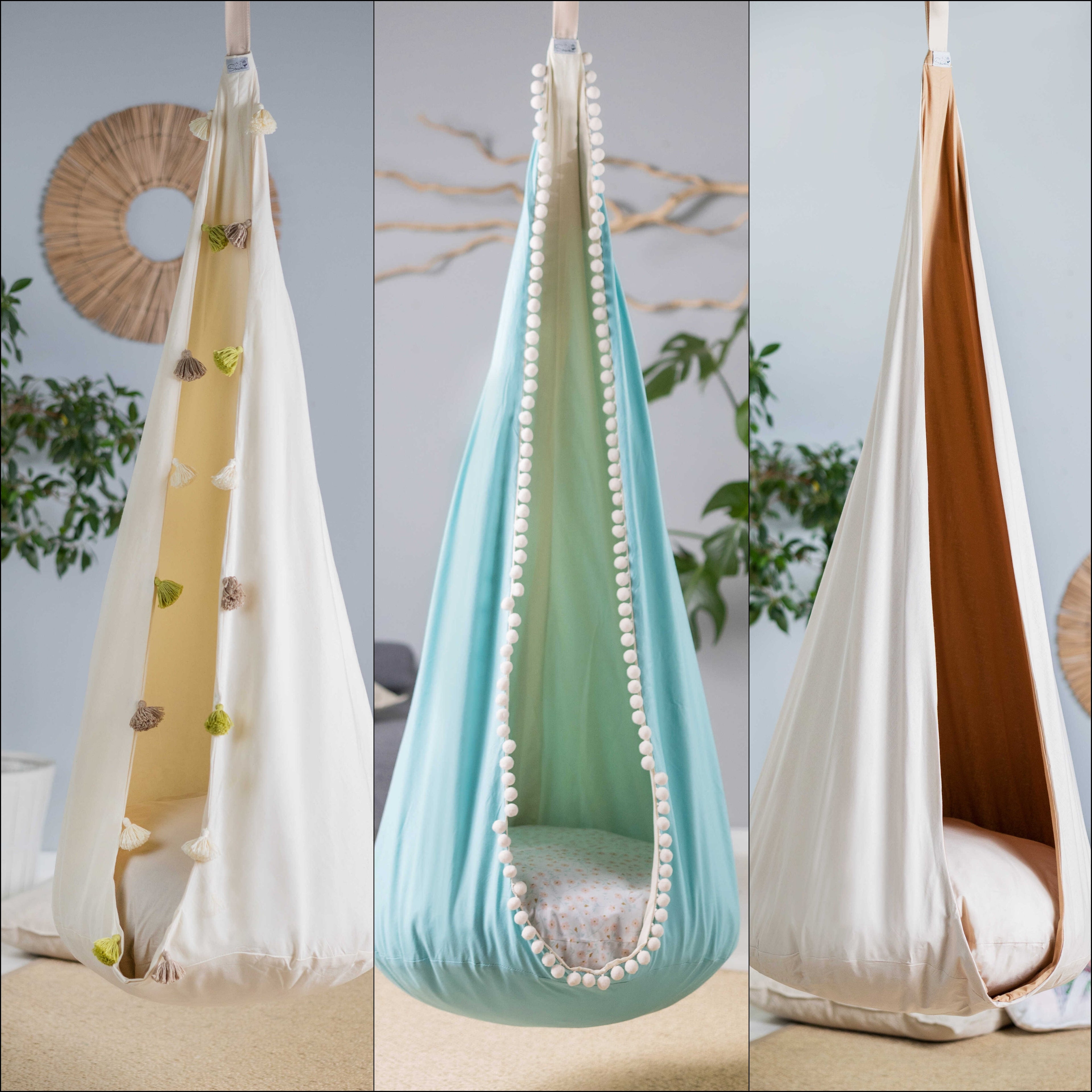 Handmade Hanging Cocoon Swings for Kids with Premium Quality and Stylish Design. Our Kids Cocoon Swings are beautifully made with high quality fabric designed to be durable and last long.